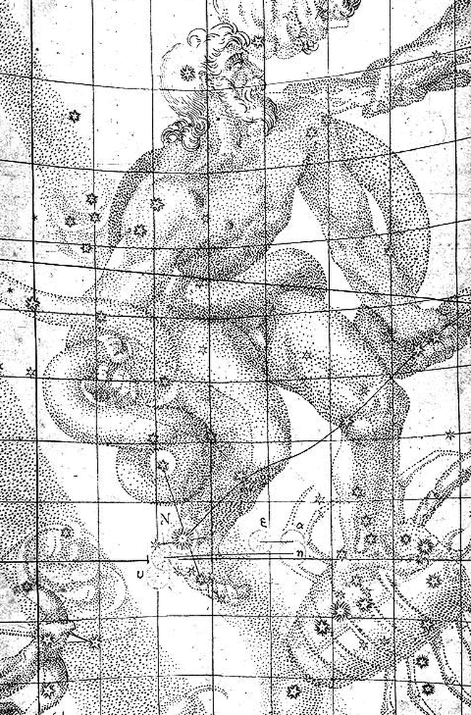जोहान्स केपलर की पुस्तक ‘डी स्टेला नोवा इन पेडे सर्पेंटरी’ (1606) से मूल चित्र, जो स्टेला नोवा के स्थान को दर्शाता है।